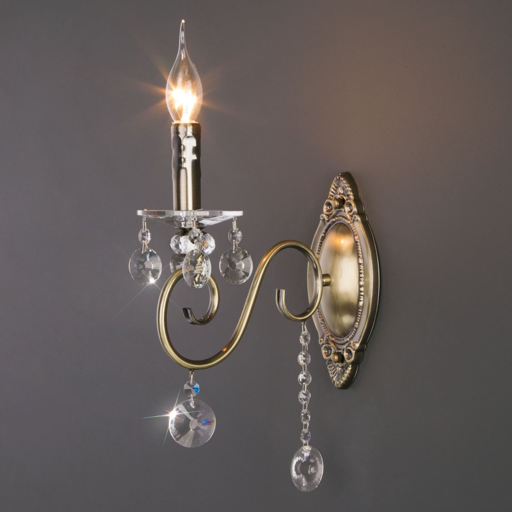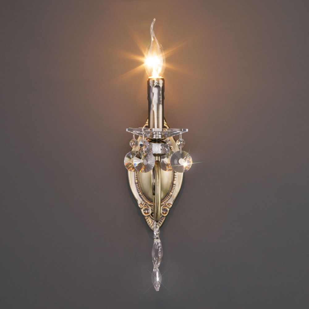 Патрон рассчитан на максимальную мощность ламп накаливания 60 Вт. Корпус светильника выполнен из высококачественного и прочного металла с надежным покрытием. Бра легко устанавливается при помощи крепежной планки, которая обеспечивает надежную фиксацию светильника на стене. Классическое бра с изящными формами гармонично сочетается с хрустальными люстрами и станет отличным завершением композиции вашей гостиной или спальни.