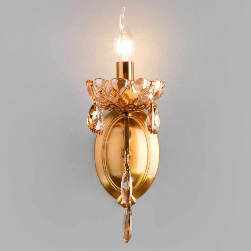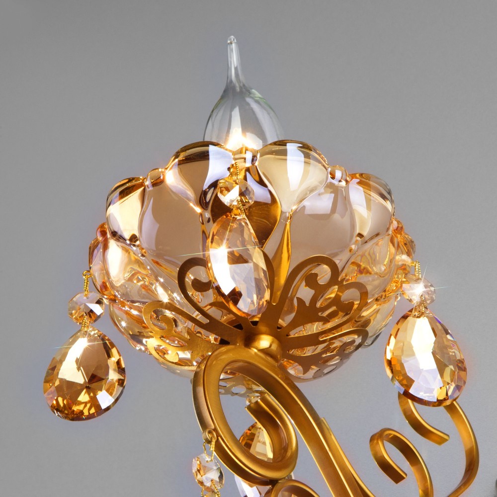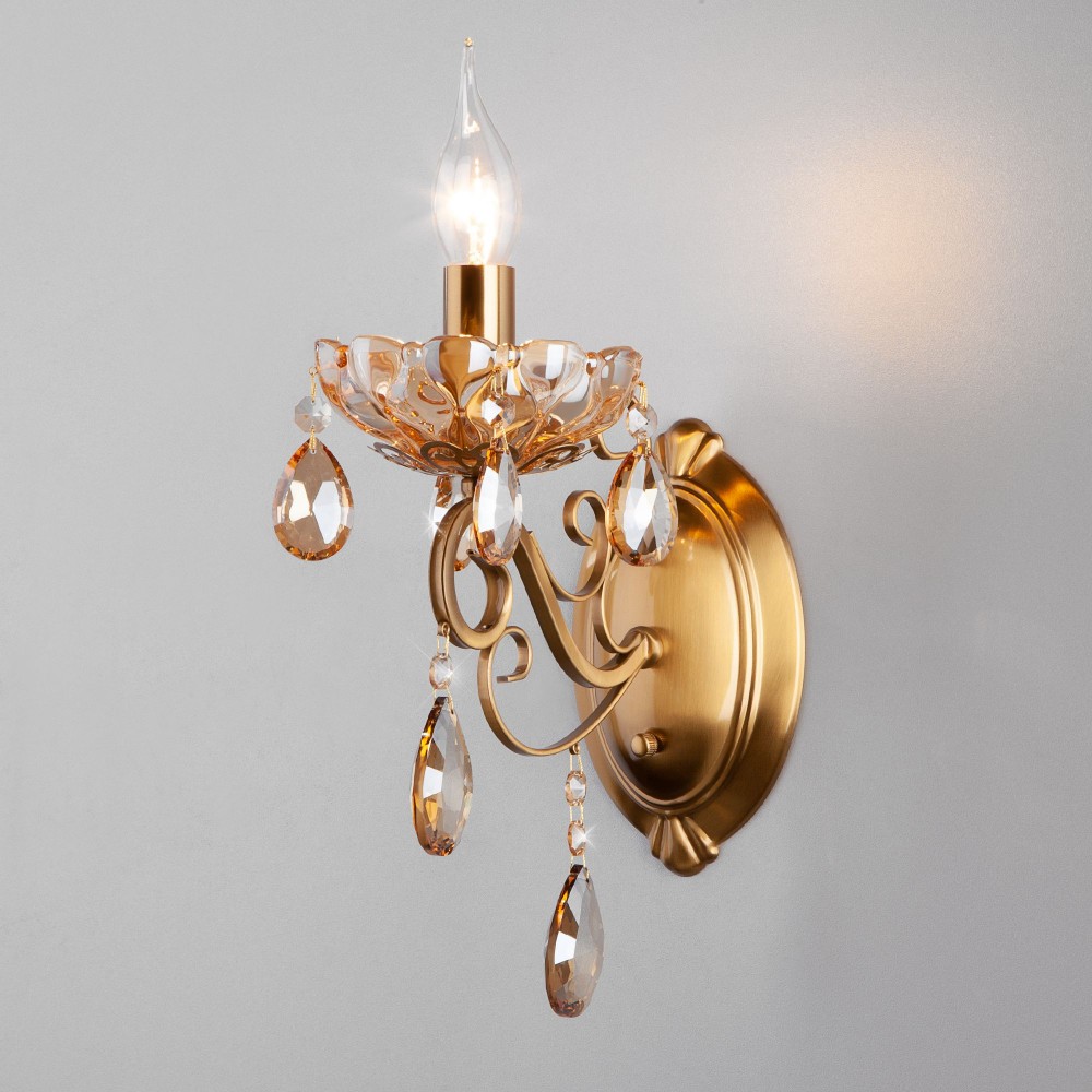 Классическое бра с хрусталем 10109/1 бронза/тонированный хрусталь Strotskis станет ярким световым акцентом в классических интерьерах и создаст качественное освещение на площади 4 м². Эффектные чаши подсвечников украшены хрустальными подвесками, которые искрятся в лучах света, наполняя помещение выразительным блеском. В качестве источника света используются сменные лампы типа свеча на ветру с цоколем E14.