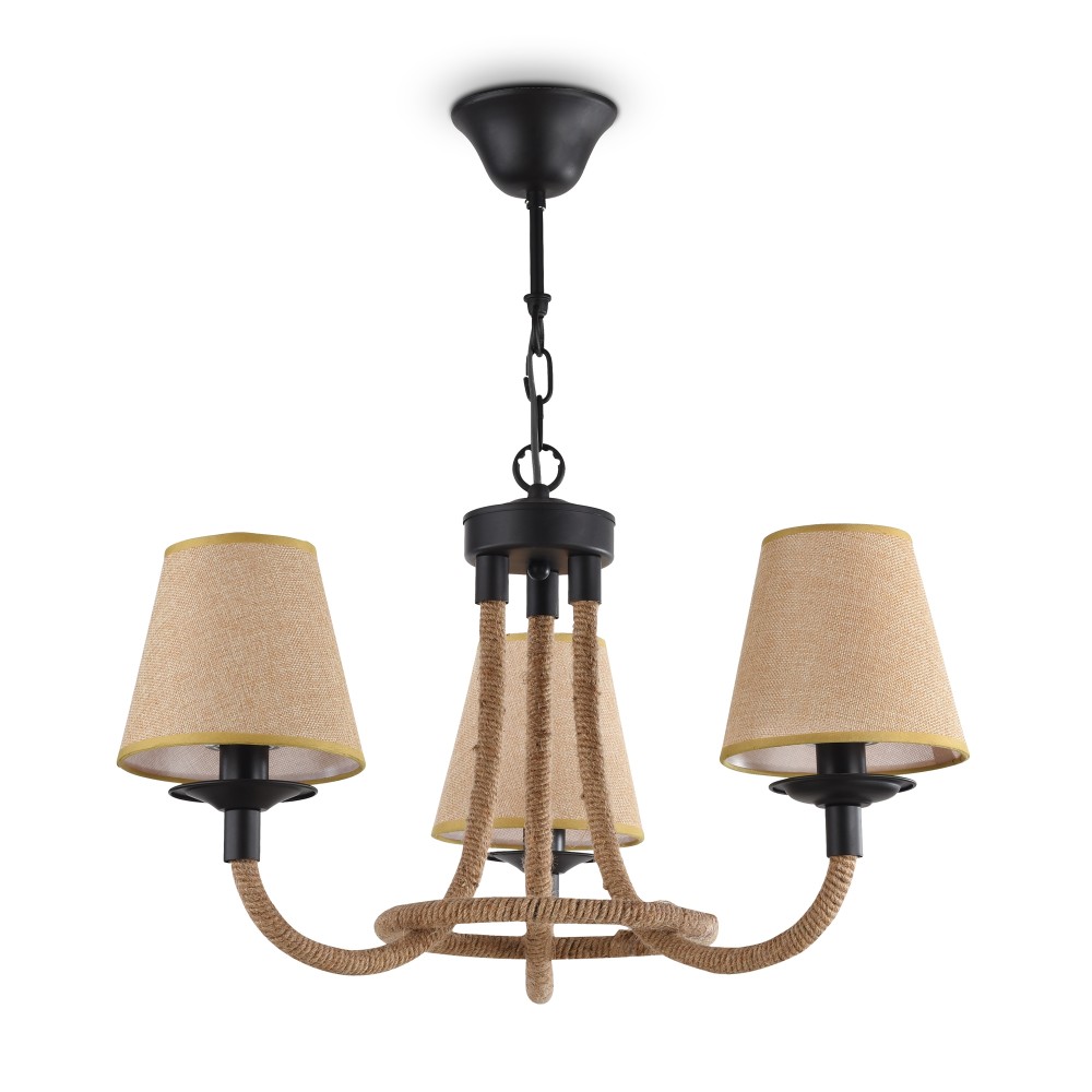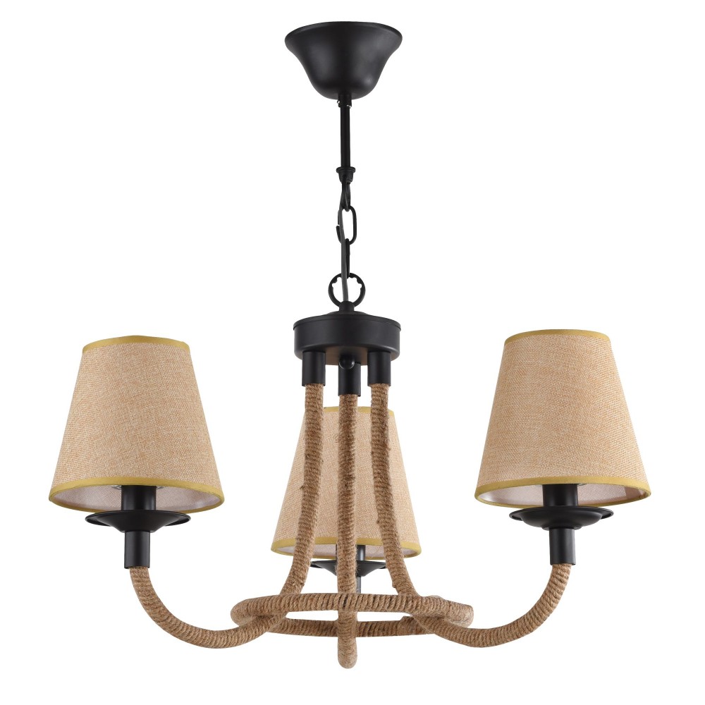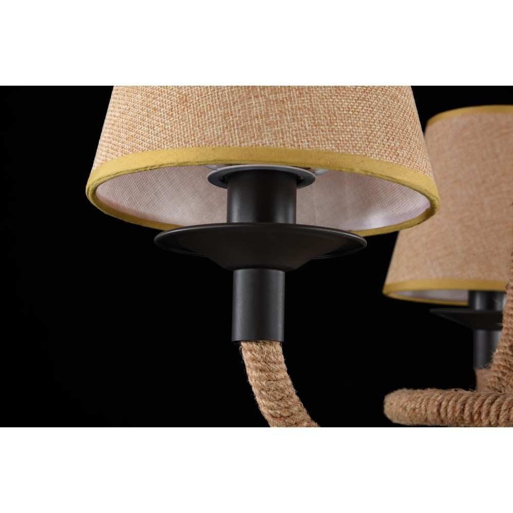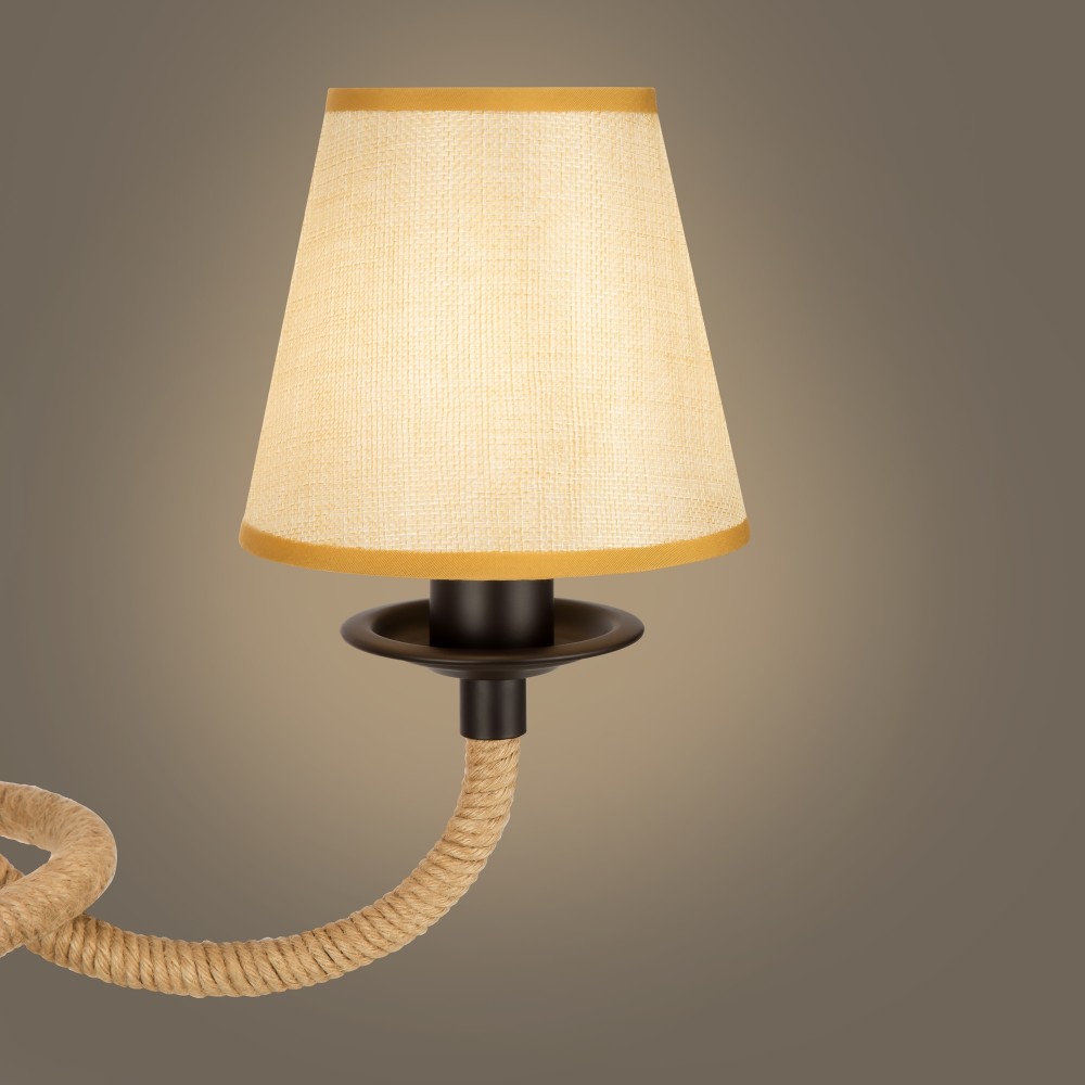 Серия светильников создана под влиянием основных принципов эко-дизайна, с использованием натуральных материалов для предметов интерьера. Арматура люстры из матового черного металла с легким золотым патинированием гармонично сочетается с абажурами из холщовой натуральной ткани. Рожки и центральная часть люстры плотно обвиты холщовой веревкой. Окантовка на верхней и нижней части абажура желто-песочного цвета.
