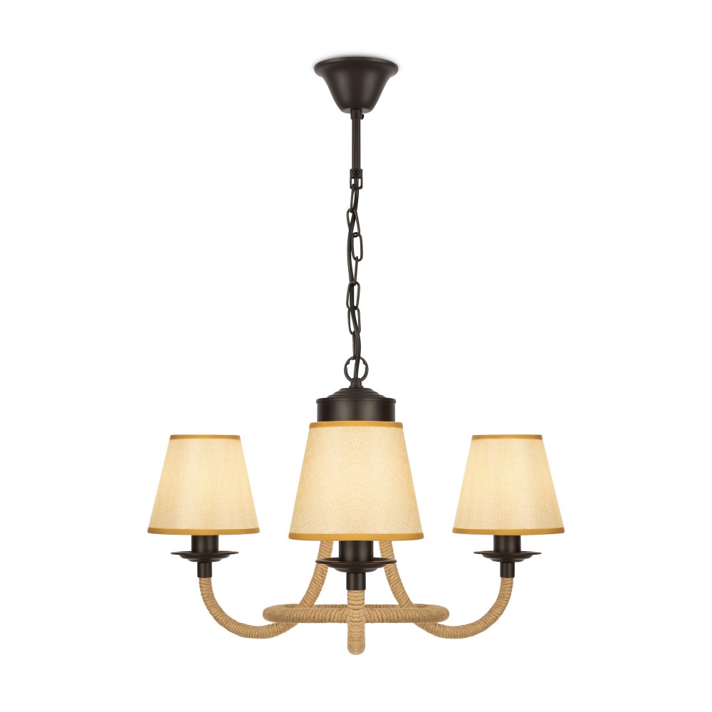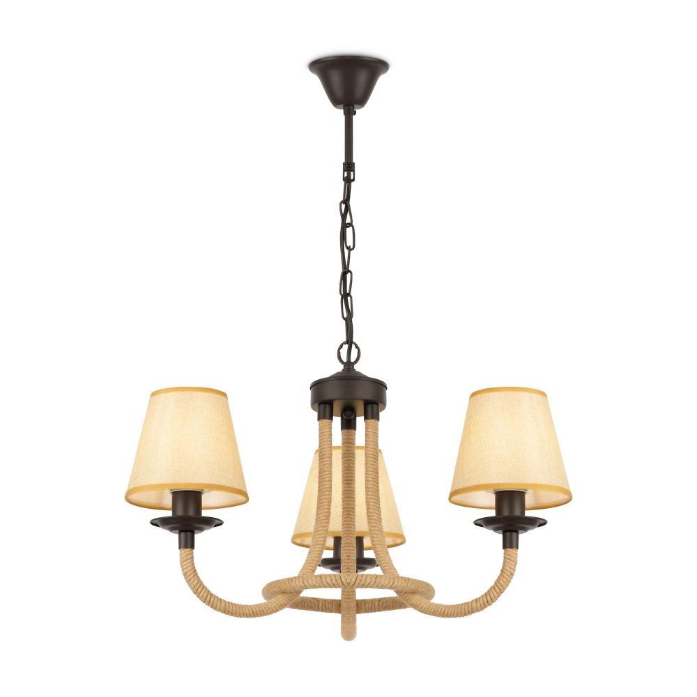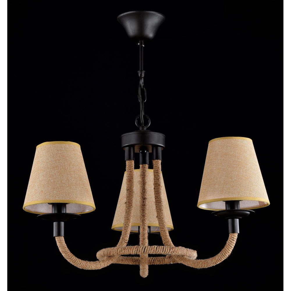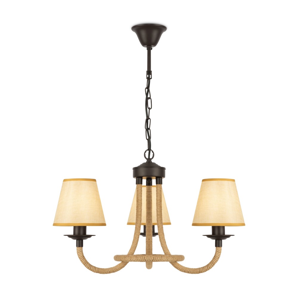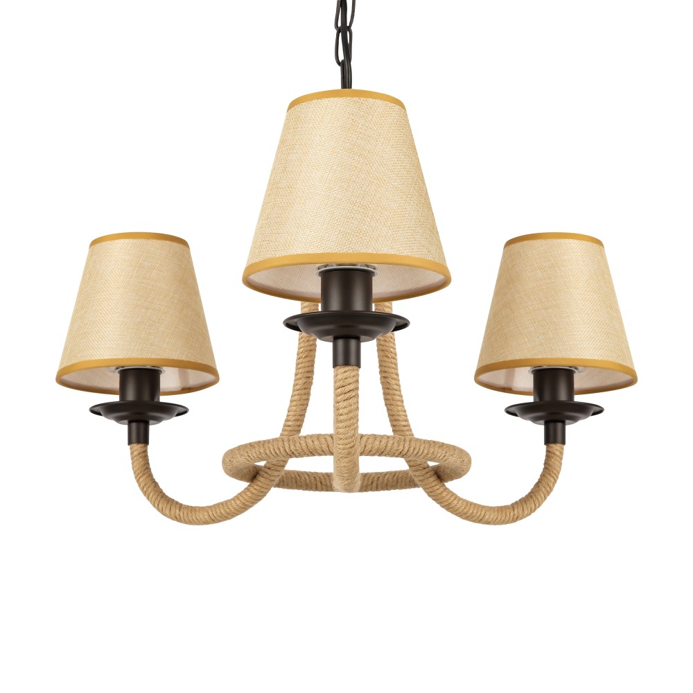Серия светильников создана под влиянием основных принципов эко-дизайна, с использованием натуральных материалов для предметов интерьера. Арматура люстры из матового черного металла с легким золотым патинированием гармонично сочетается с абажурами из холщовой натуральной ткани. Рожки и центральная часть люстры плотно обвиты холщовой веревкой. Окантовка на верхней и нижней части абажура желто-песочного цвета.