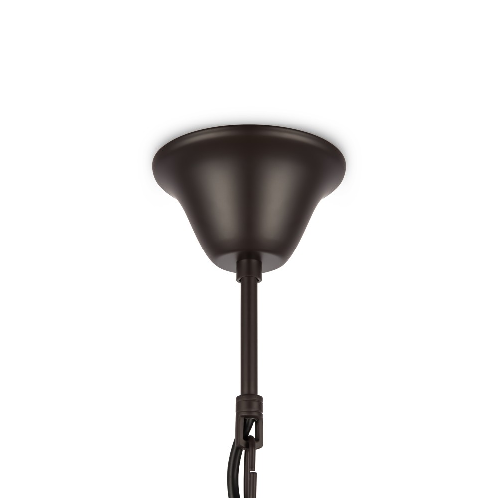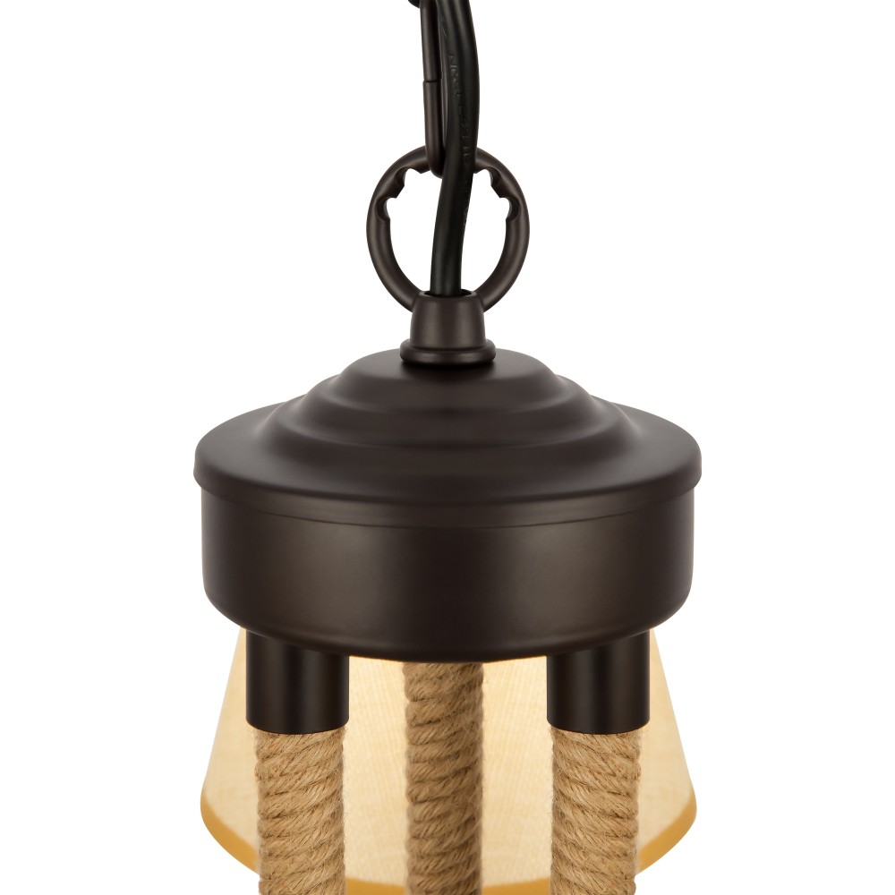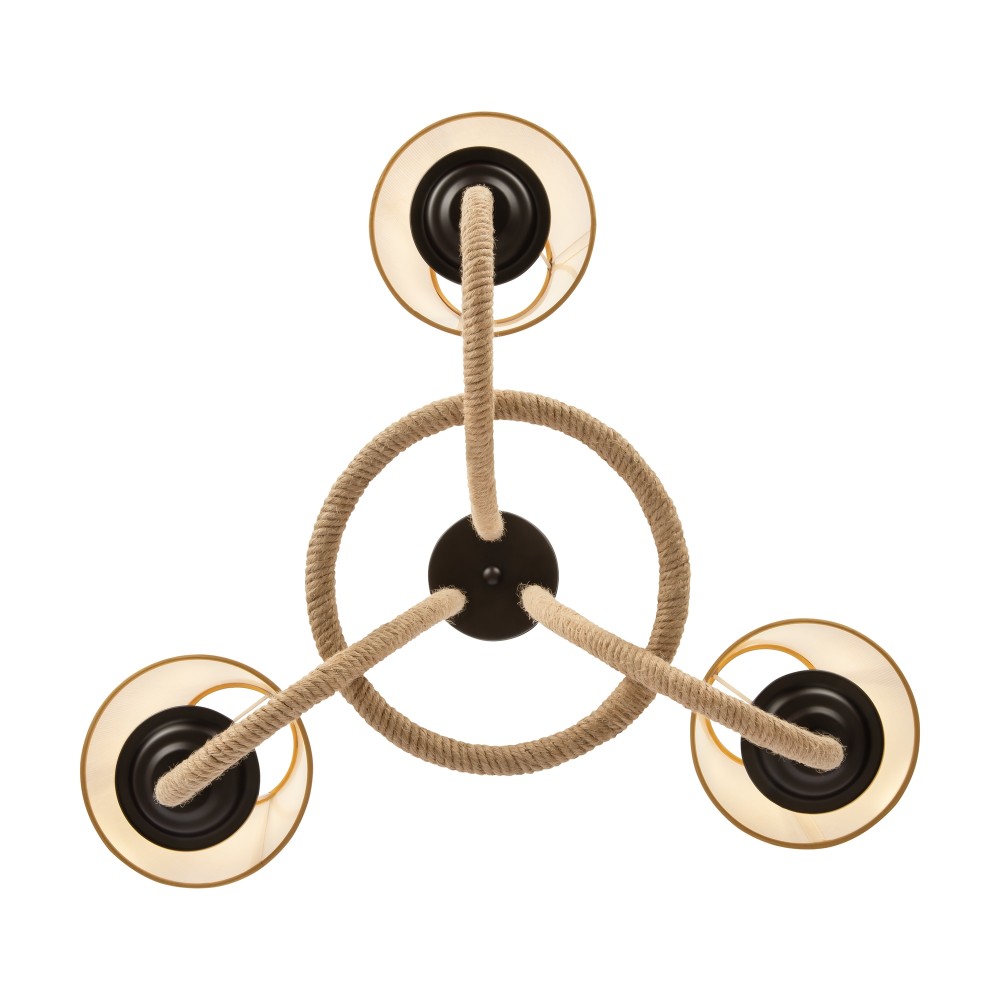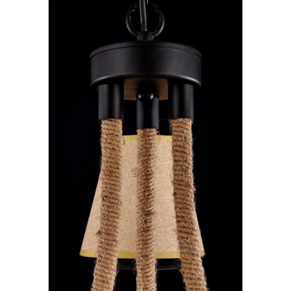 Серия светильников создана под влиянием основных принципов эко-дизайна, с использованием натуральных материалов для предметов интерьера. Арматура люстры из матового черного металла с легким золотым патинированием гармонично сочетается с абажурами из холщовой натуральной ткани. Рожки и центральная часть люстры плотно обвиты холщовой веревкой. Окантовка на верхней и нижней части абажура желто-песочного цвета.