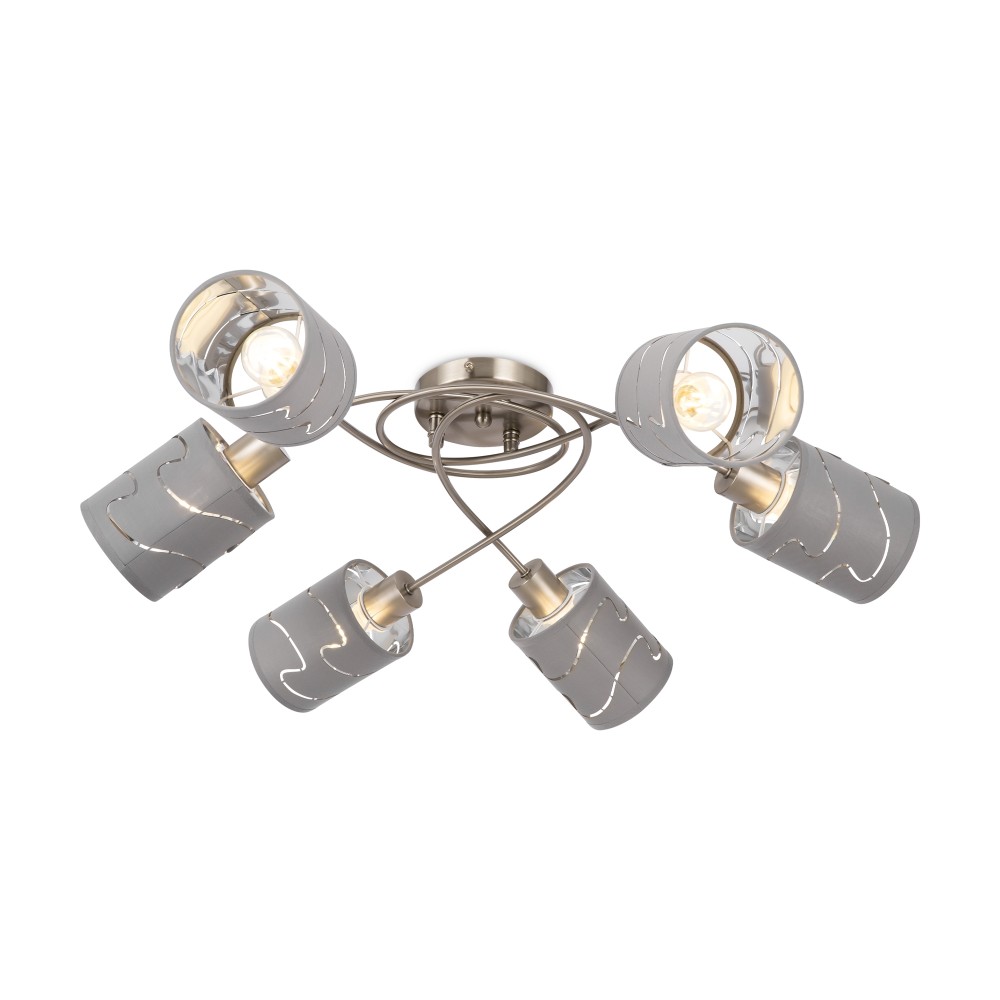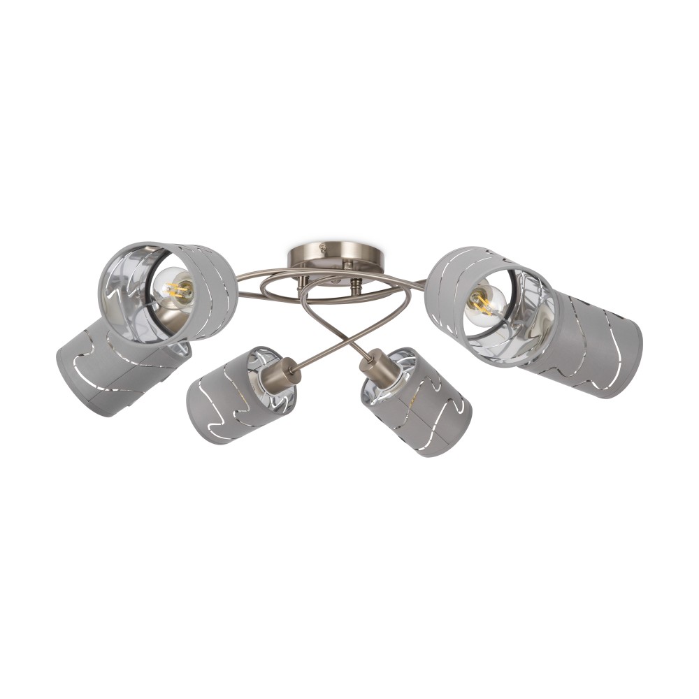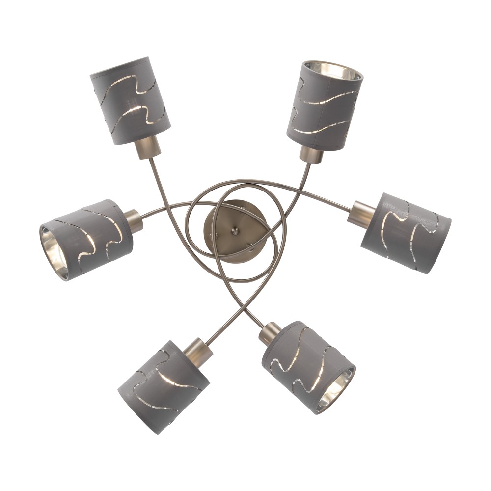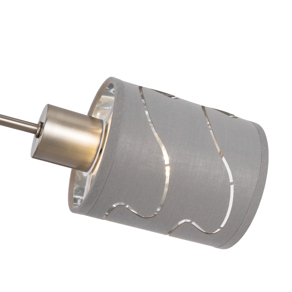 Серия стильных светильников в современном стиле. Одно из преимуществ светильников - компактность, благодаря которой их можно использовать в помещениях с невысокими и низкими потолками. Арматура сделана из металла, а абажуры - из ткани цвета "хром". Абажуры украшены узором из прорезей.