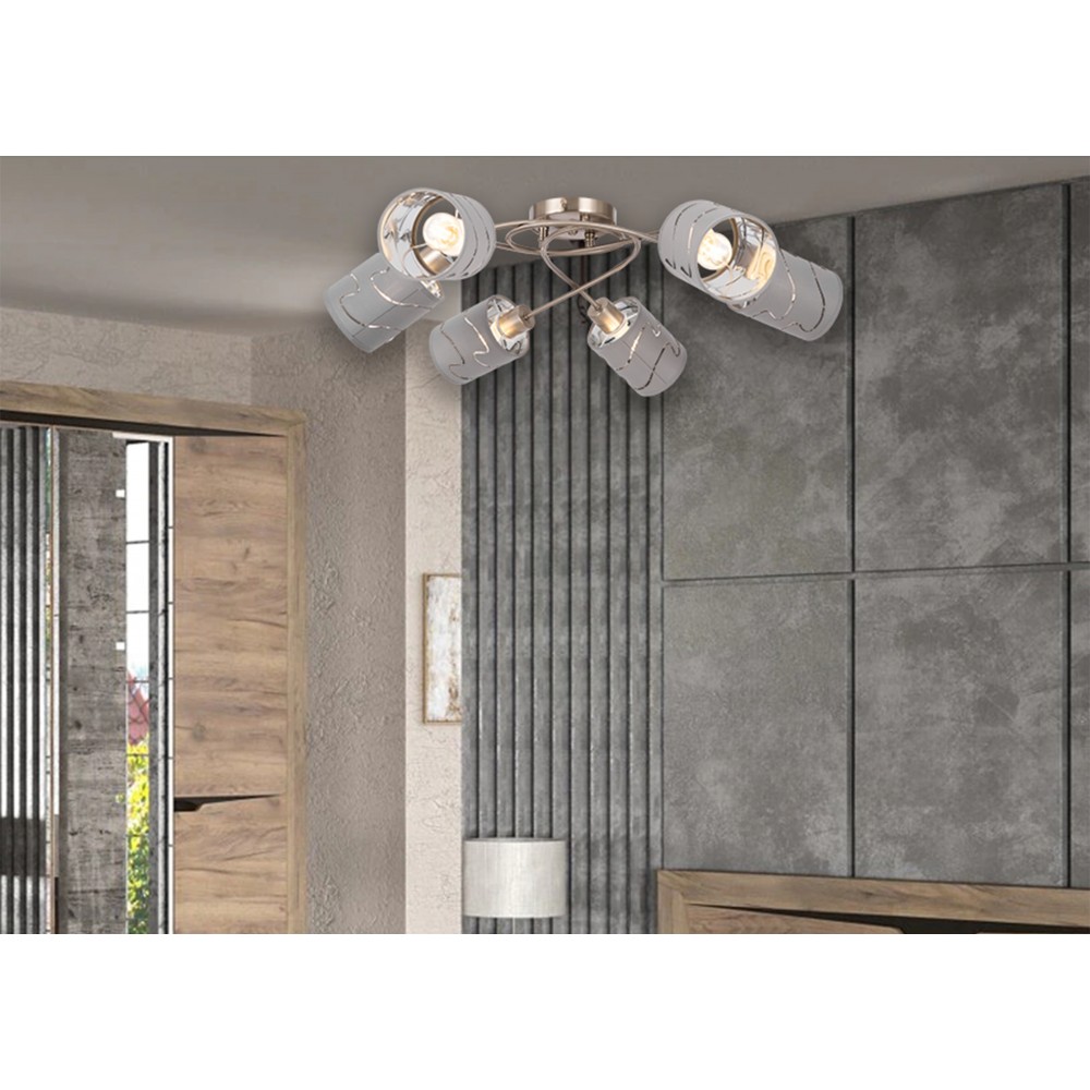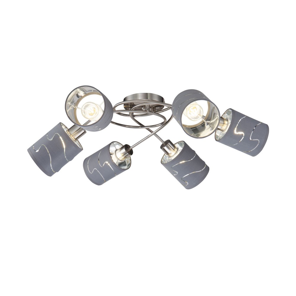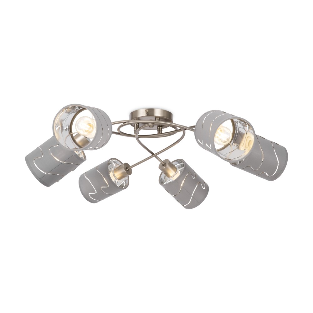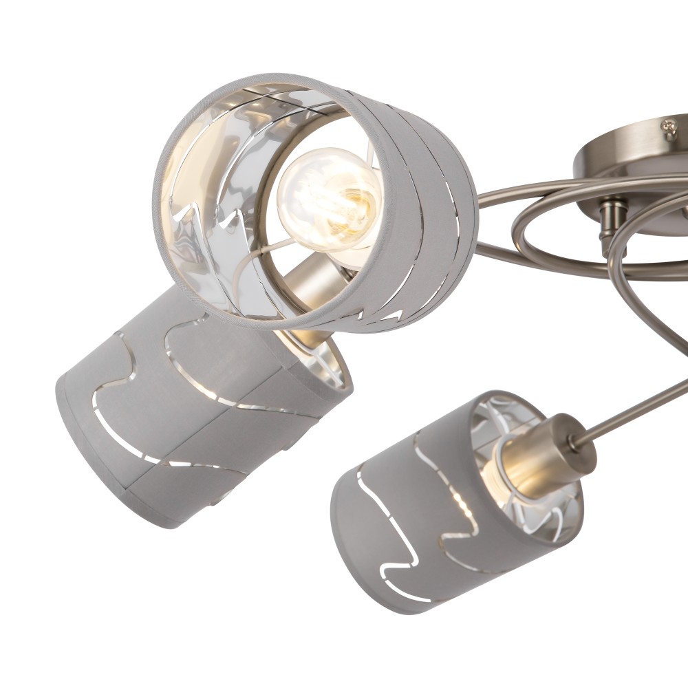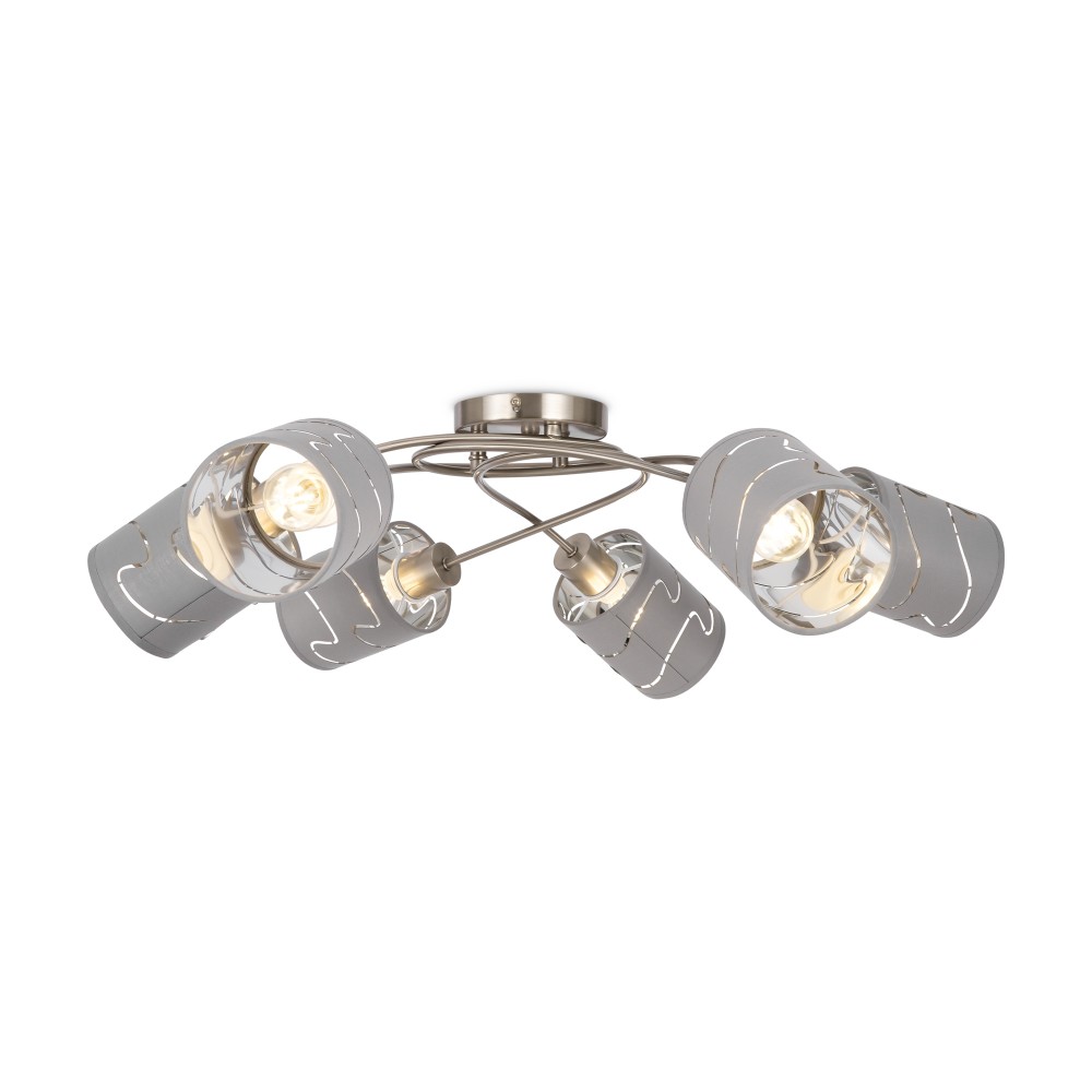 Серия стильных светильников в современном стиле. Одно из преимуществ светильников - компактность, благодаря которой их можно использовать в помещениях с невысокими и низкими потолками. Арматура сделана из металла, а абажуры - из ткани цвета "хром". Абажуры украшены узором из прорезей.