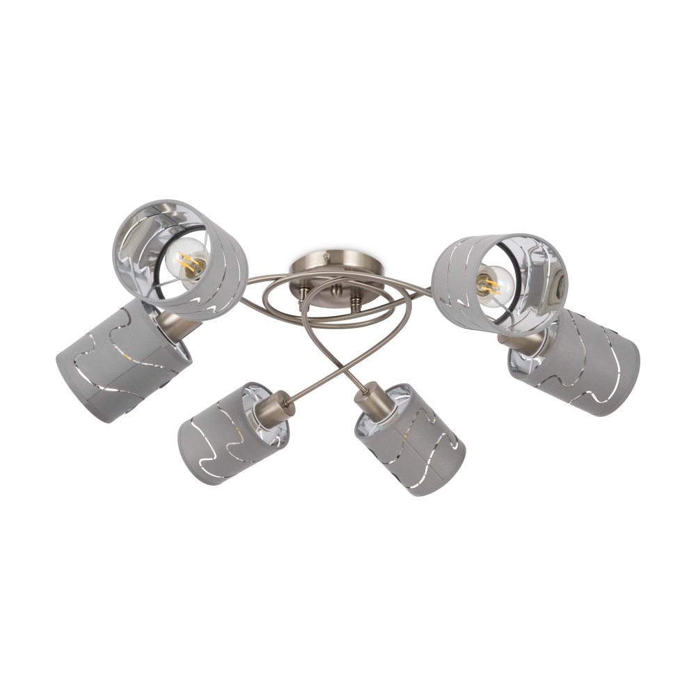 | Полное наименование | Серия стильных светильников в современном стиле. Одно из преимуществ светильников — компактность, благодаря которой их можно использовать в помещениях с невысокими и низкими потолками. Арматура сделана из металла, а абажуры — из серой ткани на хромированном ПВХ, усиливающем светоотдачу. Абажуры украшены узором из прорезей. |