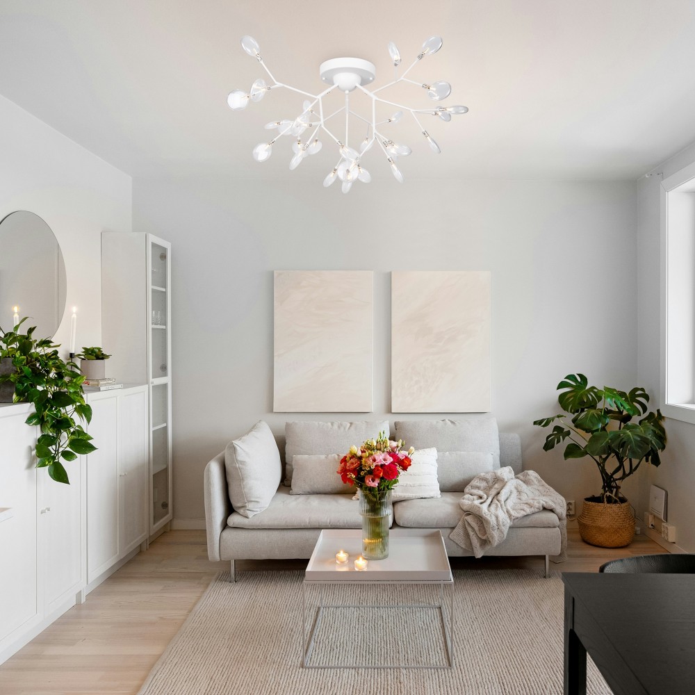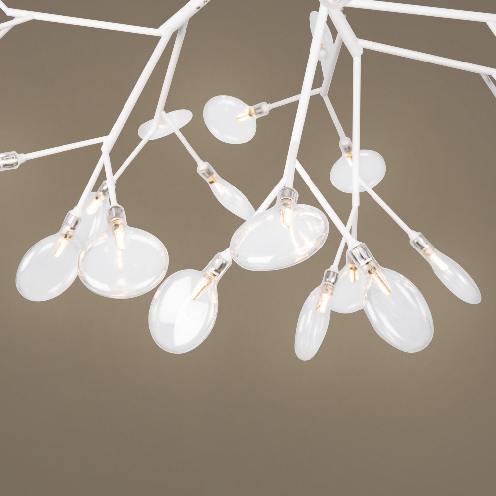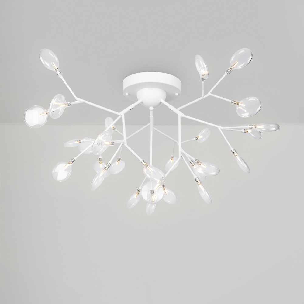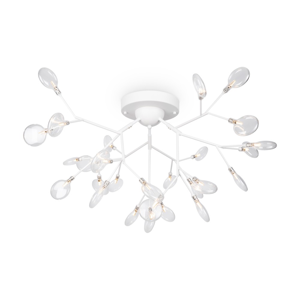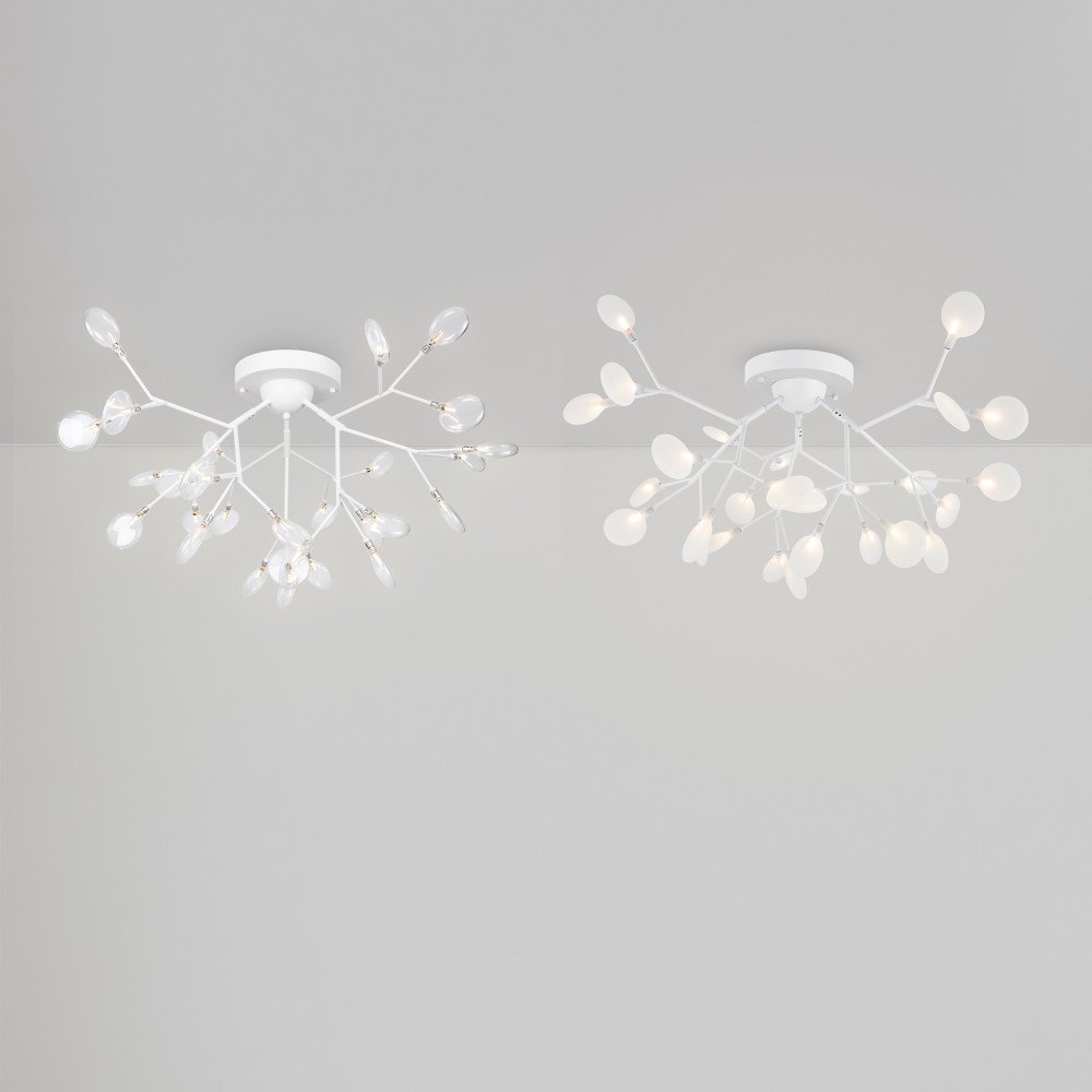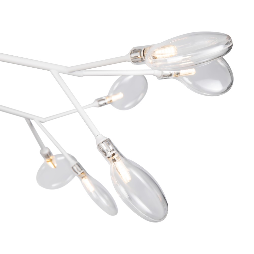 Материал арматуры – металл. Оттенки – черный, белый. Стеклянные плафоны оригинальной формы. Трендовый флористический дизайн. Источник света – лампа G4.