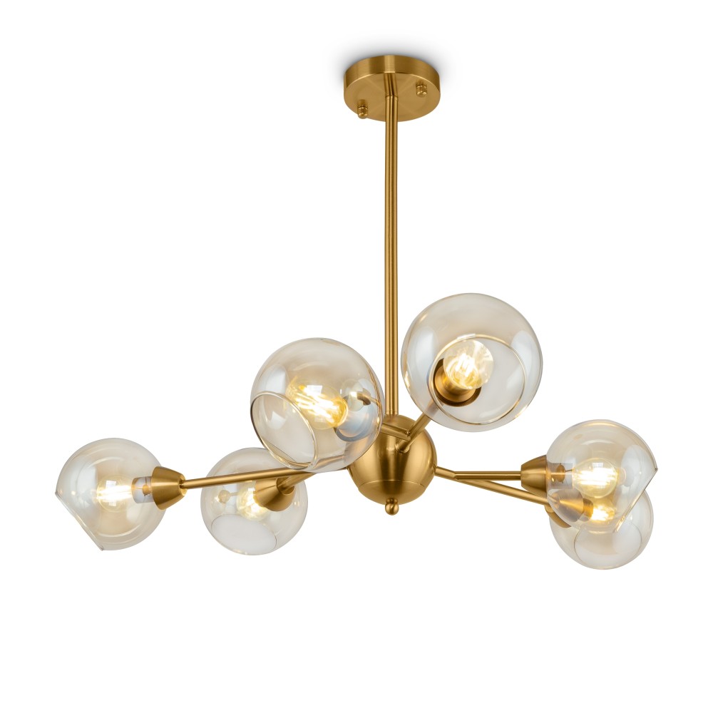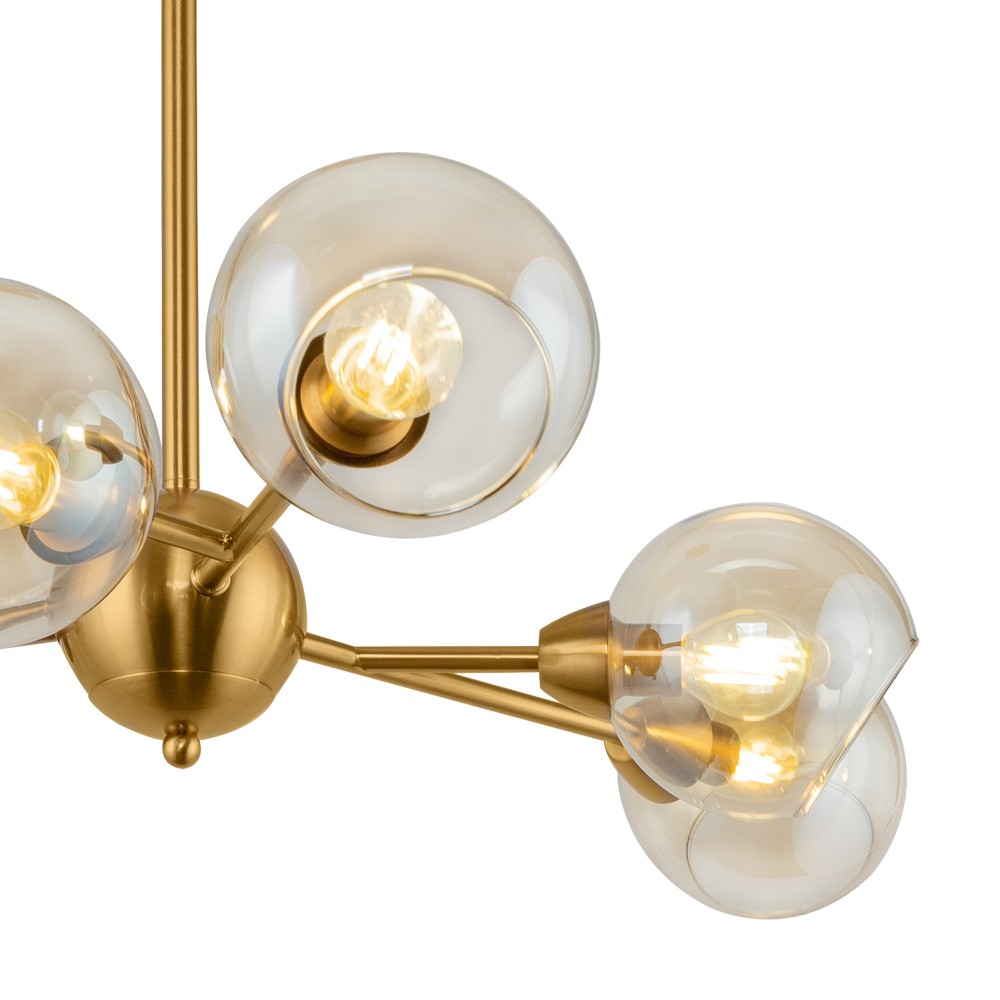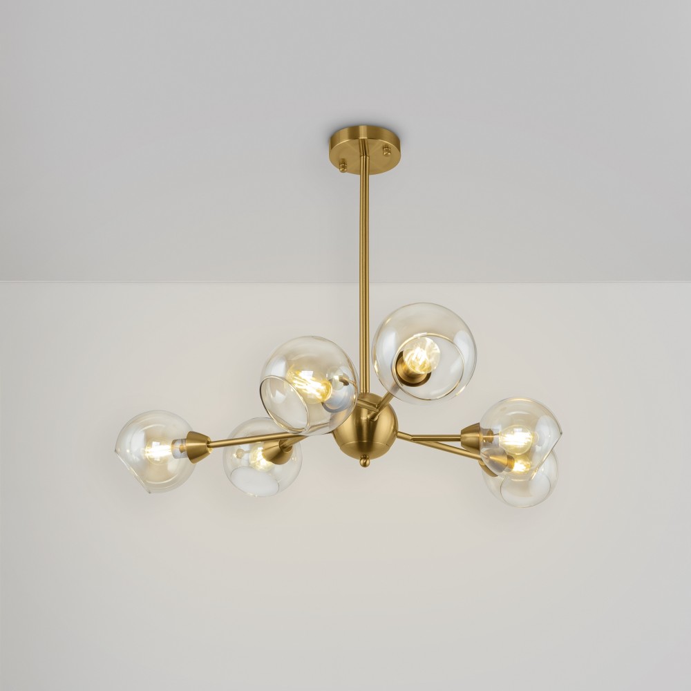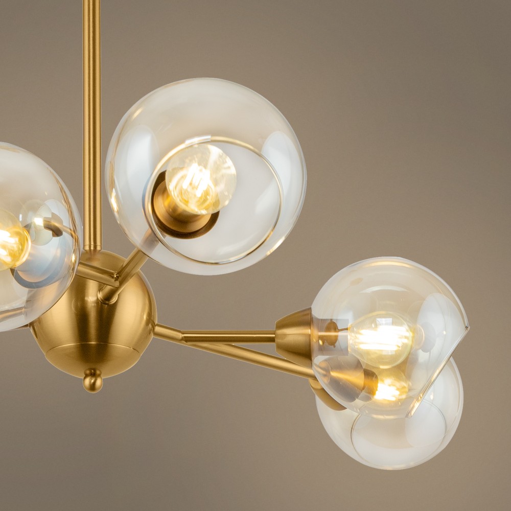 Материал арматуры – металл. Цвет – античная латунь. Округлые плафоны из прозрачного стекла. Равномерное распределение светового потока. Трендовая «молекулярная» форма. Источник света – лампа с цоколем E14.