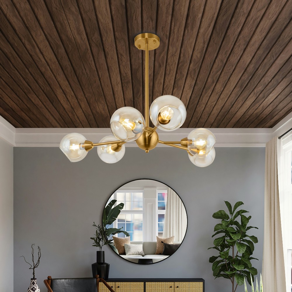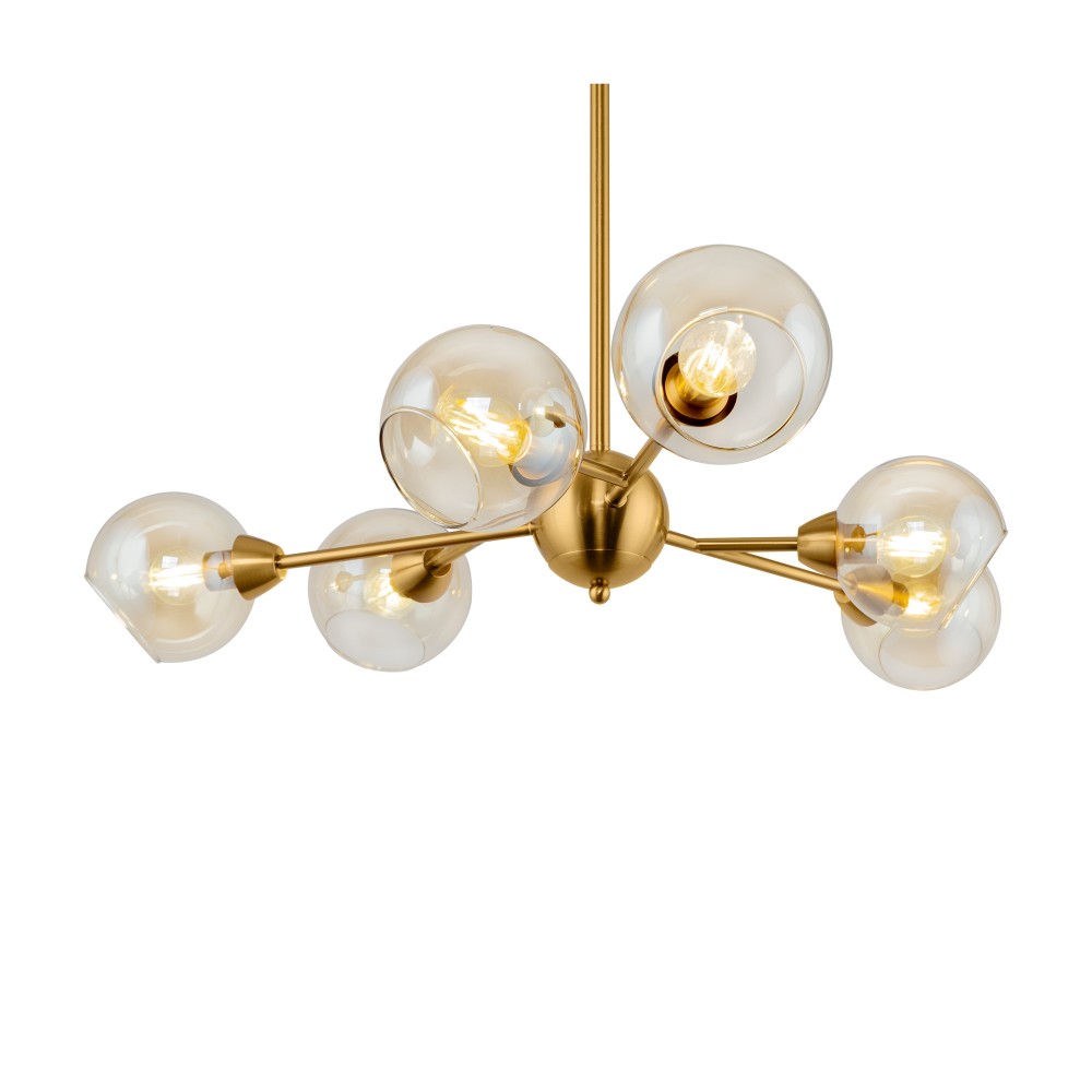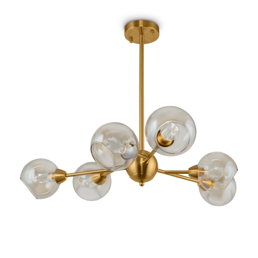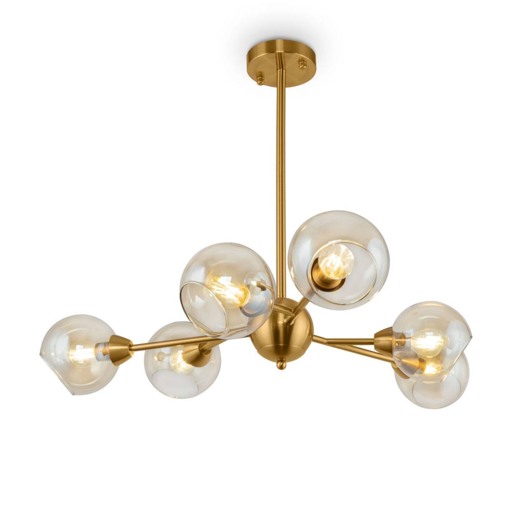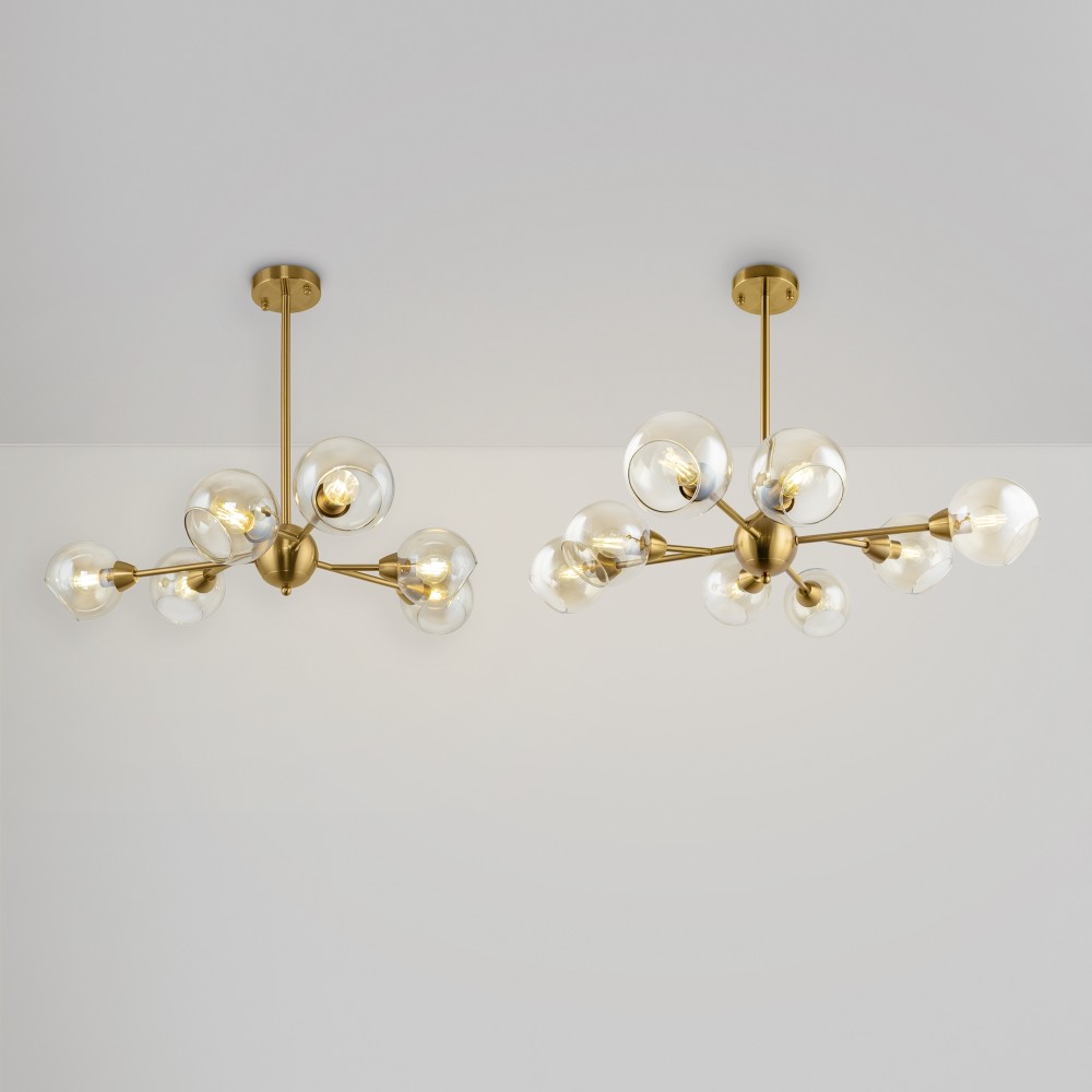 Материал арматуры – металл. Цвет – античная латунь. Округлые плафоны из прозрачного стекла. Равномерное распределение светового потока. Трендовая «молекулярная» форма. Источник света – лампа с цоколем E14.