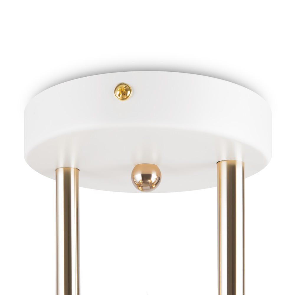 Материал арматуры — металл, цвета - латунь, черный. Плафон-сфера из белого матового цвета. Функция touch-dimming позволяет регулировать яркость света. Источник света - лампа с цоколем Е14.