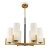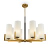 Арматура из металла, оттенок — латунь. Стеклянные плафоны в белом цвете. Часть элементов окрашена в контрастный черный оттенок. Геометрия в дизайне: цилиндрические плафоны, прямоугольные рожки.