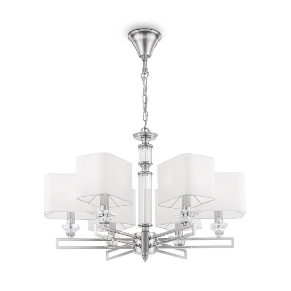 Хромированная металлическая арматура. Абажуры из белого текстиля, нанесенного на ПВХ. Стеклянный декор центральной части и розеток. Геометрические рожки.