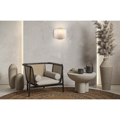 Арматура из металла, цвет – кремовый с золотом. Абажур – белый хлопок на ПВХ. Флористический декор.
