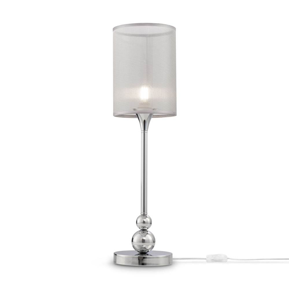 Материал арматуры – металл. Цвет – хром. Абажуры из полупрозрачной органзы серебристого оттенка. Декор – хромированные шары. Высота люстр регулируется. Одиночный подвес с цоколем Е27, лампа, бра, торшер и люстры – Е14.