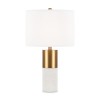 Металлическая арматура, цвет – латунь. Абажур – белый хлопок. Изюминка дизайна – элементы из натурального камня (алебастра). Трендовый микс фактур. Лаконичные формы в американском стиле. Источник света - лампа с цоколем Е14.