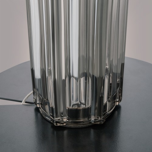 Металлическое основание - дополнено скульптурным литым стеклом в трех оттенках: прозрачном, дымчатом и пудрово-розовом. Хлопковый абажур белого цвета. Цоколь Е27.