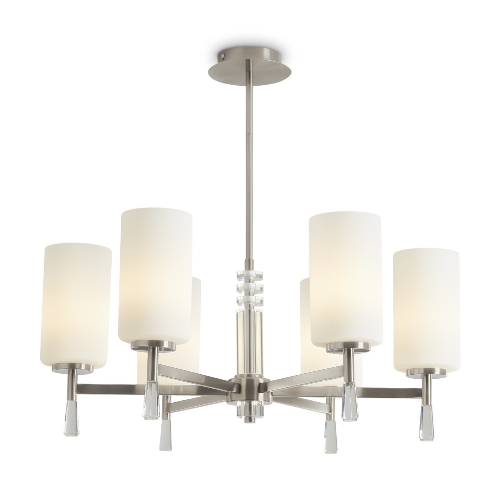 Металлическая арматура: латунь или никель (новинка серии).Белые стеклянные плафоны цилиндрической формы, направленные вверх.. Хрустальное основание с акриловыми каплями. Лампа E27.