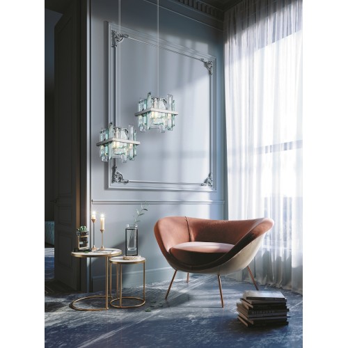 Арматура из металла, цвет – хром. Плафон составляют пластины из прозрачного оптического стекла. Металлический каркас плафона окрашен в тон арматуре. Высота подвесных моделелей регулируется.