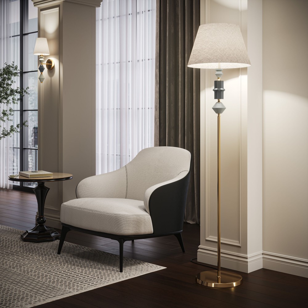 Арматура в цвете латунь придает торшеру легкость и воздушность, а нейтральный абажур создает мягкий, рассеянный свет.